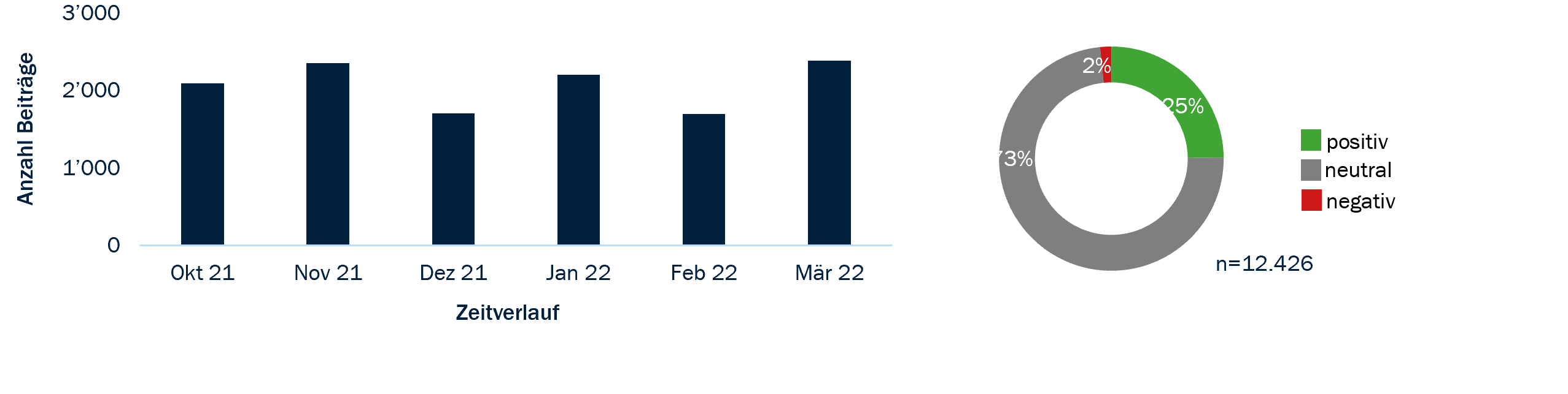 Das Themenfeld «neue Arbeitswelt» geniesst derzeit eine hohe gesellschaftliche Relevanz, was sich auch im öffentlichen Diskurs niederschlägt: Zwischen Oktober 2021 und März 2022 sind in deutschsprachigen Onlinemedien und auf Social Media knapp 12’500 Beiträge zu diesem Thema erschienen. Auf Monatsbasis betrachtet lässt sich jedoch kein Trend herauslesen: Die Berichterstattung war über alle sechs Monate konstant hoch; den bisherigen Höhepunkt markierte der Monat März. Insgesamt erzielten die Beiträge eine Reichweite von über zehn Milliarden potenzieller Kontakte und 42’600 Interaktionen. 73 Prozent der Berichterstattung war neutral, bei einem Viertel liess sich eine positive Tonalität feststellen, und zwei Prozent waren in einem negativen Tonfall verfasst.