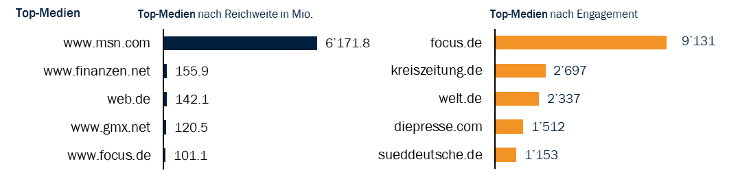 Mehr als 60 Prozent der enormen Reichweite erklären sich durch Beiträge des beliebten Nachrichtenportals msn.de. focus.de kann über 21 Prozent der Reaktionen für sich verbuchen. Auch verschiedene überregionale Zeitungen gehörten zu den Medien, denen es gelang, ihre Leserschaft am besten zu hohem Engagement zu motivieren.