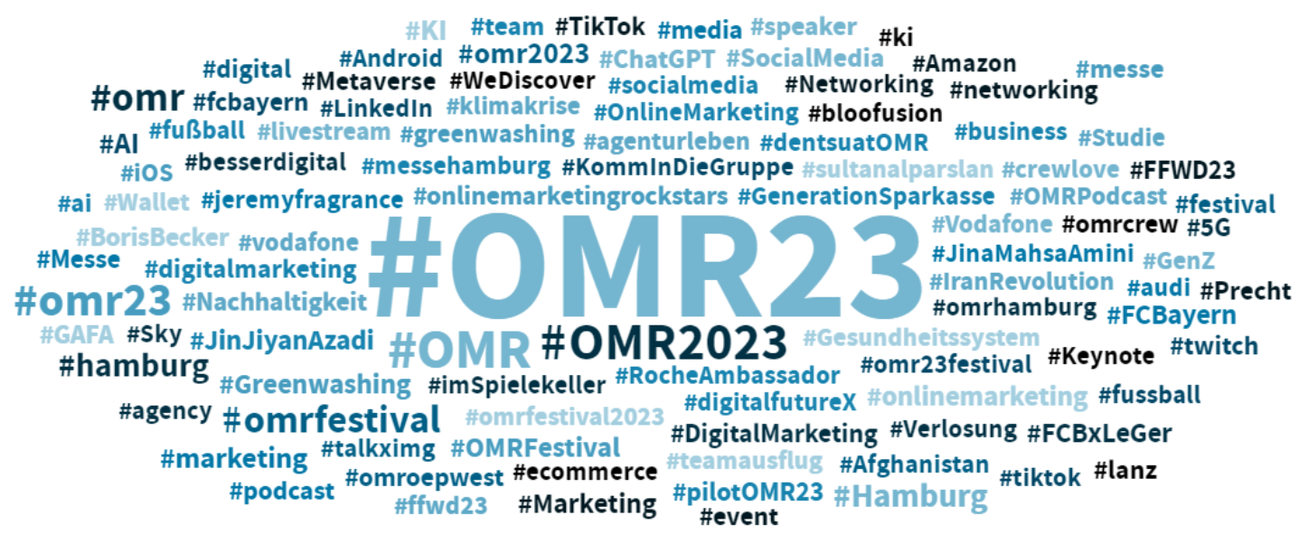 Weiterhin hat uns natürlich interessiert, welche Themen besonders aufmerksamkeitsstark waren und wie die OMR insgesamt wahrgenommen wurde. Beiden Fragestellungen haben wir uns mit voll automatisierten Analyse-Features genähert. Zur Auswertung der Themenschwerpunkte haben wir uns zunächst die Top-Hashtags des Festivals angeschaut.