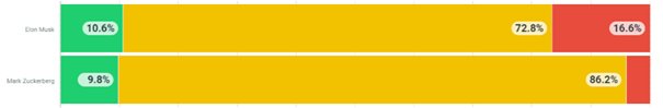 Auch über Musk wird deutlich kritischer berichtet. Dies legt zumindest die automatische Sentiment-Analyse nahe. Fast 17 % der Beiträge zu Elon Musk werden als negativ eingestuft. Bei Mark Zuckerberg sind es hingegen nur 9 %.