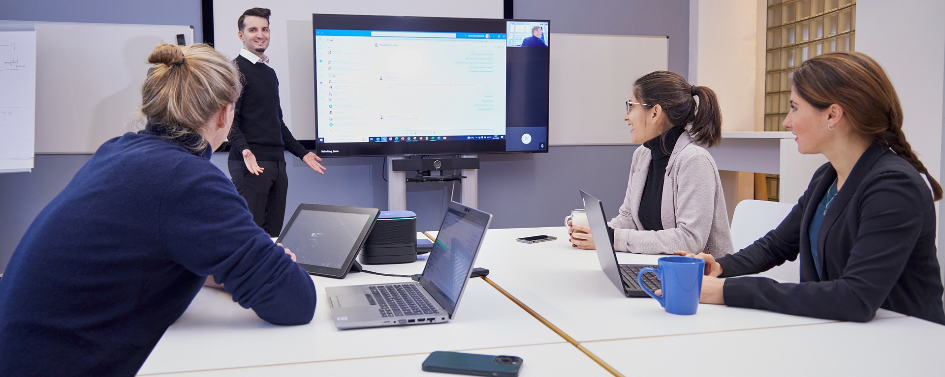 Bei uns gibt es Desk Sharing. Das heisst, dass alle Personen ihren Arbeitsplatz im Büro täglich frei wählen dürfen. Auch sind wir im Alltag eine papierlose Organisation. In unserer Cafeteria versorgen wir dich mit Wasser und Kaffee.