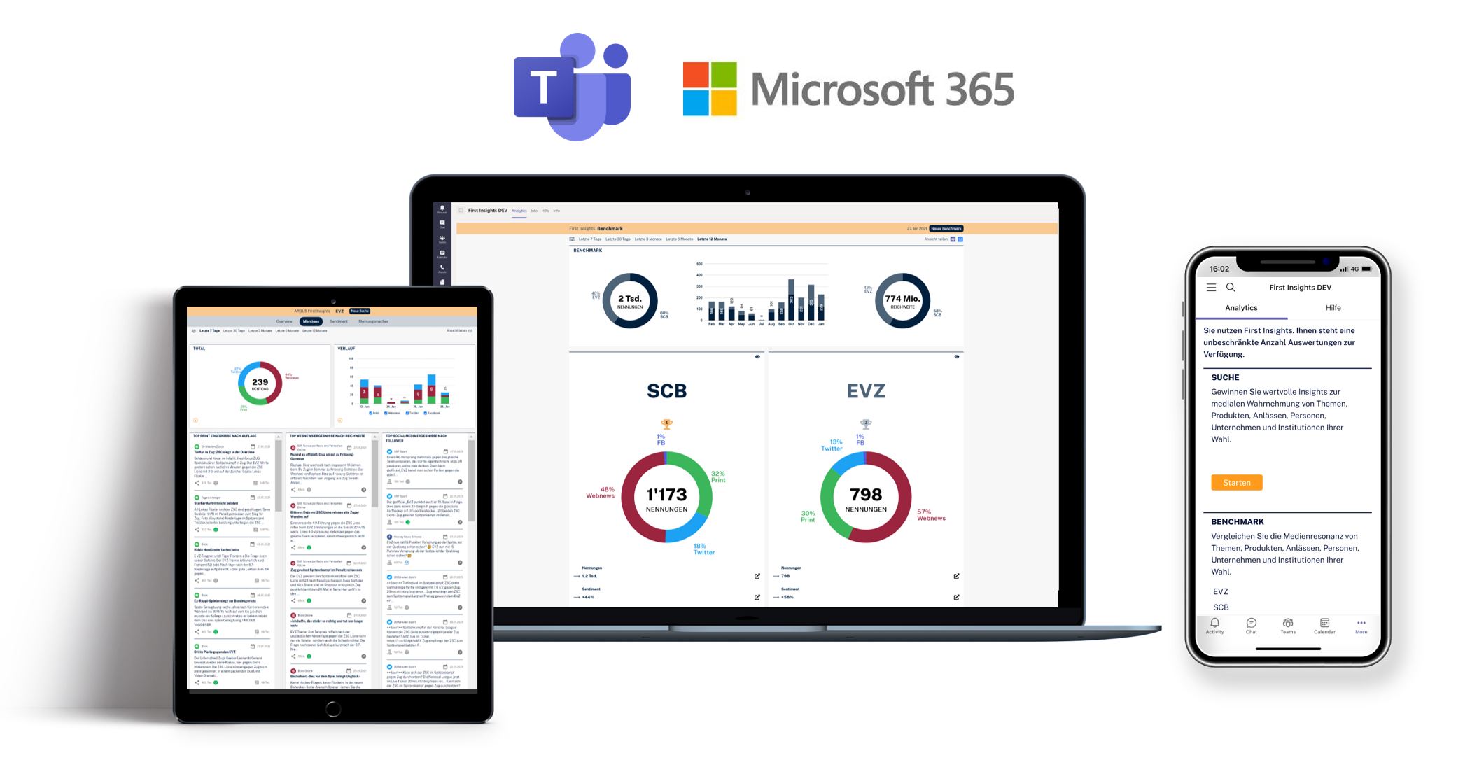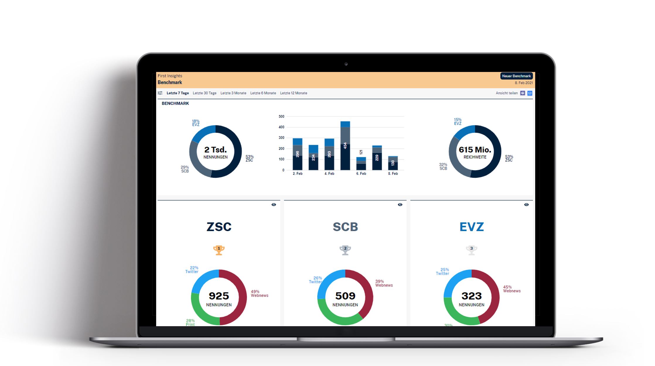 Mit First Insights erhalten Sie schnell und einfach Auswertungen zu Ihren Themen und können die eigene Medienpräsenz und die der Konkurrenz miteinander vergleichen.